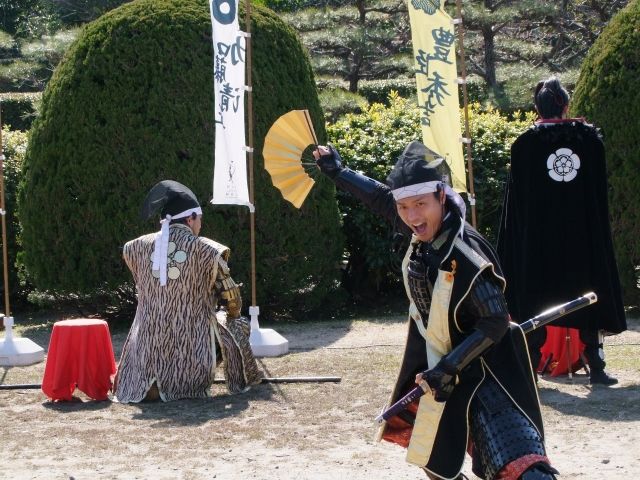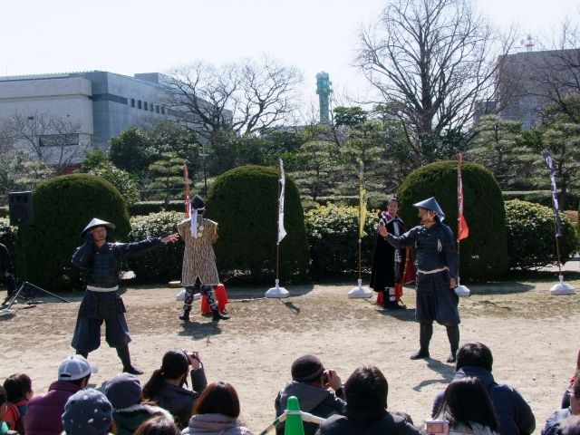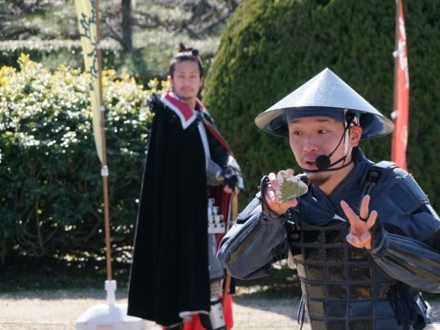 2月の冷え込み厳しい中、名古屋城での武将隊おもてなし演武時は、信長様の登場とこともあり、県外からの観光客を含めて800人以上の観客が詰めかけ賑わいを見せました。銀河からの客人を迎えるにあたり、陣笠隊・市蔵殿、亀吉殿の両コンビは、おにぎりトランプを使ったフォース力診断を実施。