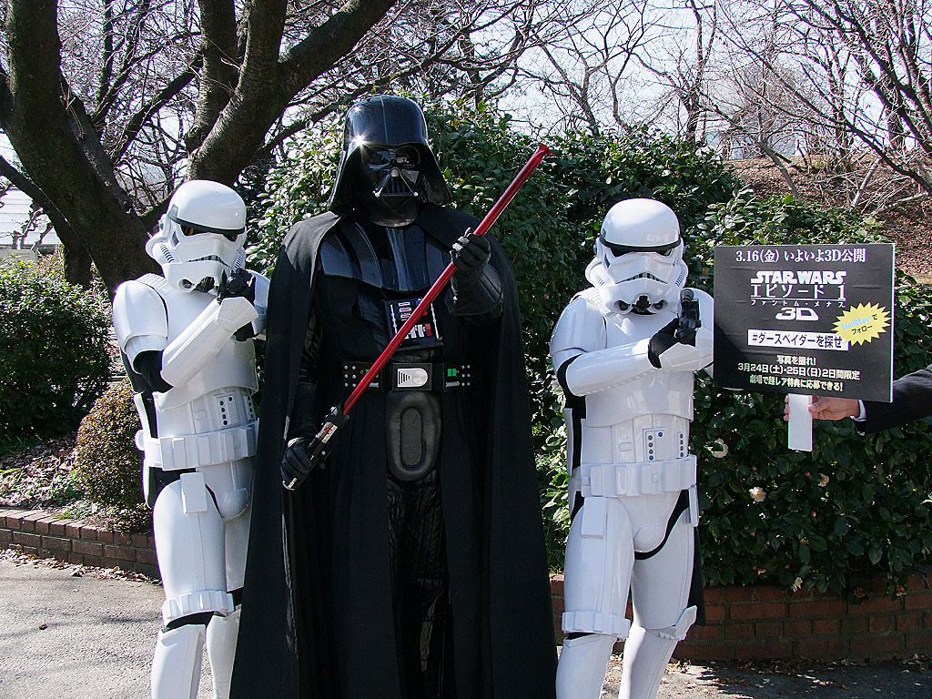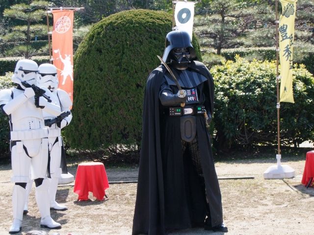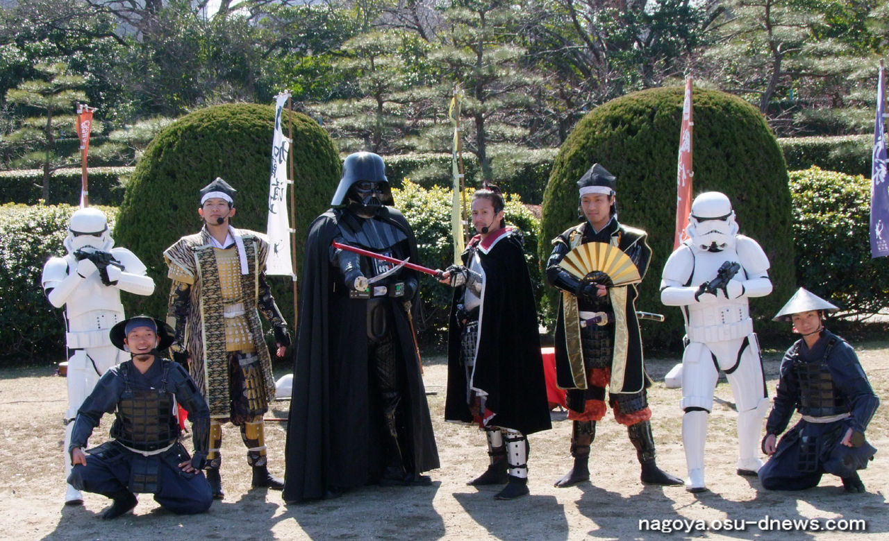 ベイダー卿の強力なフォース・チョークを受け苦しむ、名古屋おもてなし武将隊・徳川家康殿人気を誇るSF映画「スターウォーズ」がついに3D映画化!シリーズエピソードI ファントム・メナス3D3月16日公開を前に、ダースベイター卿率いる帝国軍501st日本部隊トルーパーが、2012年2月19日(日)名古屋城へ来襲。名古屋おもてなし武将隊と対峙。