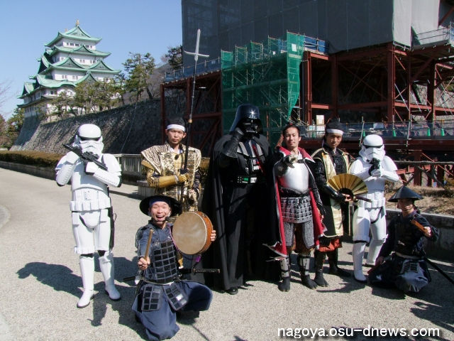 この後、ベイダー卿は、501st日本部隊トルーパーを率いて名古屋城正門へ移動。西の丸お堀前にて、名古屋城を背にふたたび武将隊とともに訪れた観光客に記念撮影に応じました。