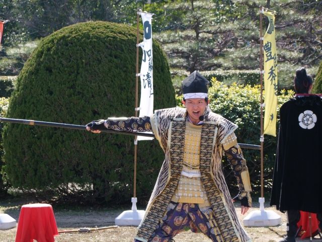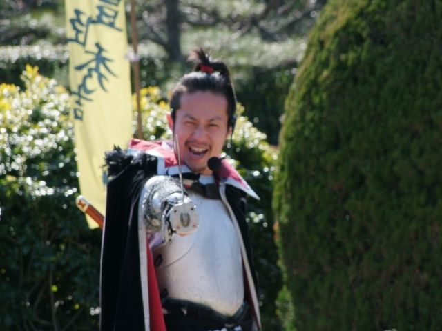 市蔵殿が手に持ったトランプの柄と数字を亀吉殿が当てようとしますが、ダイヤの3と答える亀吉殿に市蔵殿は、「おしい!クローバーの3だ!」と演武前の観客を楽しませました。今回登場した武将隊メンバーは、織田信長殿を筆頭に徳川家康殿、前田利家殿の3武将が登場。「ワシの演武で嫌なことを忘れさせたる!(信長)」と出陣メンバー全員で演じられる新演武パパイヤダンスは、相変わらず激しくキレのある踊りで観客を魅了。
