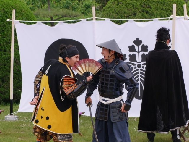 「傾奇御免状」編では、「前田慶次」を主役に「前田利家」「加藤清正」の3英槍武将によるコミカルなストーリー。「本能寺の変」編では、「織田信長」を主役に演じられる物語。信長亡き後の天下盗り「豊臣秀吉」「徳川家康」誰が受け継ぐのかを描くシビアな演目でした。この寸劇は、順次新しい物語の登場予定あり。