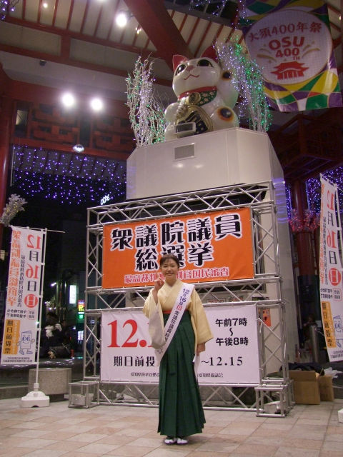 東海地方で活躍する講談師「古池鱗林」さんも襷をかけ、12月16日(日)の衆議院議員選挙の呼びかけ。