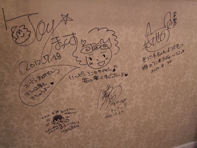 【写真】CospRex店内ポストカードお渡し会の後、金元寿子さんは、壁に来店記念のサイン。13時から始まったトークショーでは、ジョイまっくす氏より、2012年今夏よりサンシャインサカエが実施していた夏色サンシャイン「すーぱーそに子」コラボキャンペーンのご縁で、ここ名古屋をよく訪れたことの紹介。今回、こちらの会場を借りて声優イベントを初めて開催できました。ジョイ、初体験大好き!! これを機会に、ここサンシャインサカエで、声優イベントが出来るようになりたい。と挨拶がありました。