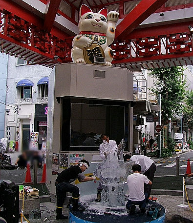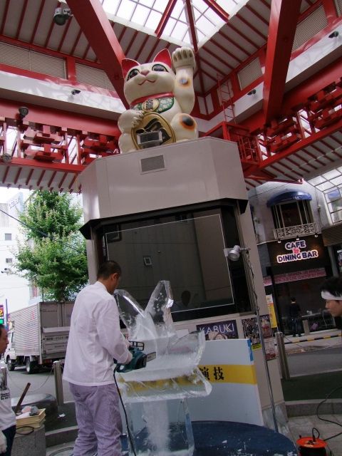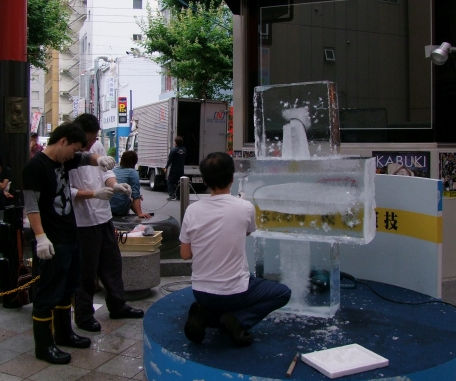 第37回氷の彫刻コンクールが、2013年6月28日(金)大須・万松寺通商店街にて開催。コンテストを前に、午後3時よりふれあい広場前にて、模範演技が実施。今回は東急チームから3名が1時間以内に作品を作り上げます。