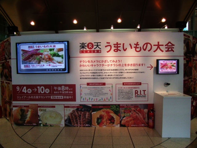 今回JR名古屋タカシマヤにて開催されてい「楽天市場うまいもの大会(2013)」では、1F桜通口ステージにて、ARカメラを活用した、出展店舗PR「AR-人気(HITOKE)」の体験コーナーが設置。来場者に気軽にAR体験できるスペースになっています。
