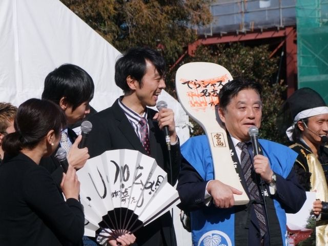 13時より名古屋城西の丸特設コーナーにて開催されたこのイベント、1時間前から開催を楽しみに待ちわびる観光客を尻目に、開催直前ステージ前スペースを、各テレビ局取材陣がカメラスペースを陣取り占拠。わざわざ広島から応援に訪れた観客からの猛烈な抗議を受けるなどトラブル。ステージに登場した河村名古屋市長は、ちょっと渋い顔も。今回は、現在名古屋観光PRでらシャス名古屋と広島観光PRおしい広島の対決で、ご当地おもてなし武将隊・名古屋おもてなし武将隊と安芸ひろしま武将隊が演武対決。甲冑ダンスを披露する名古屋隊に対して、安芸隊は、イケメン武将ロックで「天下一」奪取を高らかに歌い上げました。