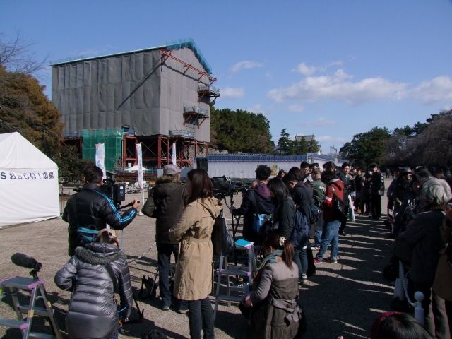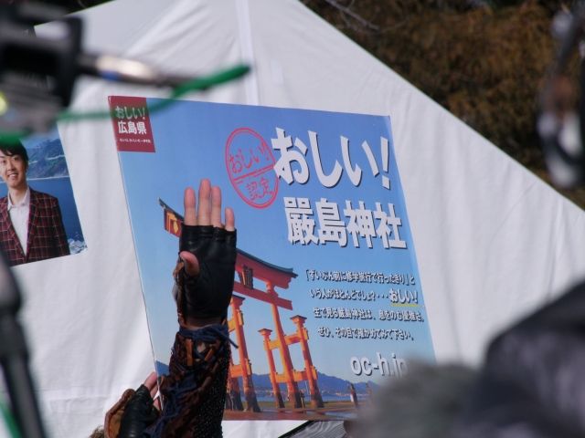 【写真】おしい!報道カメラの人垣で、広島の観光PRが全く見えない(笑観光地対決では、名古屋側が、河村名古屋市長から名古屋城本丸御殿のPR、広島からは厳島神社や弥山(みせん)のパワースポット対決。