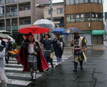 名古屋市・西区長の熊崎氏は、甲冑姿で登場。「あいにくの雨となりましたが、参勤交代ウォーキングに大勢の方にお集りいただき、ありがとうこざいます。皆様方が、今日歩いていただく西区界隈は、名古屋の表玄関、名古屋駅とシンボルであります名古屋城を結ぶところにあり、大部分が名古屋市の西区になります。