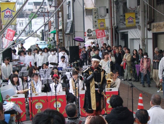 商店街アーケードの東端・五条橋横のイベントスペースでは、学生による生演奏の他、エコイベントの実施も。エコトークステージには、名古屋おもてなし武将隊から、徳川家康殿が参加。