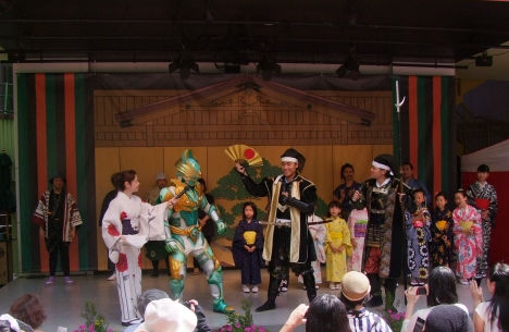 アスナル金山ステージでのオープニングイベントでは、名古屋おもてなし武将隊やご当地ヒーローグランスピアもゲストで来場。また、河村市長も登壇し、会場を盛り上げました。金山総合駅コンコースに設けられた主案内所は、富嶽三十六景から尾州不二見原(当時の大須/上前津南近辺)を模した、関所が設けられ、江戸時代にタイムスリップ。金山南ビルの南アート長屋・江戸あそび工房・北会場の市民会館会場に設けられた金山合点横丁・北アート長屋など、当時の文化を子供たちが実体験して楽しむ催しになっています。特に金山合点横丁での天秤竿を実際に肩に載せて、朝顔の鉢植えを運ぶ物売り体験コーナーや水鉄砲は、子供たちに大人気。また、明日なる!金山ステージでの「お江戸寄席小屋」では、瓦版売りの呼び込みに始まり、獅子舞や長唄三味線の上演も 8月6日・7日は、ガマの油売りなどの物売りの口上や大須演芸場で人気を博した江戸独楽曲芸など、古典演芸を観覧することもできます。