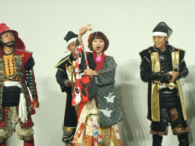 三番手、福岡黒田武将隊・黒田官兵衛殿も失敗。あいち戦国姫隊・お市の方(左下)と金澤百万石武将隊算盤侍 猪山殿(右下)、着物姿でチャレンジしますが、なかなかうまくいきません。
