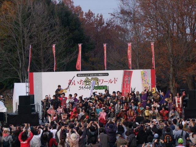 大村愛知県知事・河村名古屋市長も参加。愛知県内各所で活躍する歴史甲冑保存会・甲冑同好会が一堂に集い武者行列。2014年11月30日(日)歴史が動いた「桶狭間」合戦地エリア・県営大高緑地公園にて、戦国イベント「あいち合戦ワールド2014in大高緑地」が開催。今回のイベントは、歴史観光に取り組む愛知県が主催。名古屋おもてなし武将隊をはじめとした武将隊のムーブメントや来年2015年徳川家康公顕彰400年行事を控え、「戦国武将のふるさと愛知」の取組みの中、愛知県内で活躍する歴史甲冑保存会・甲冑同好会と各地武将隊が参加するイベントになりました。