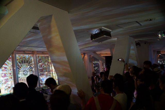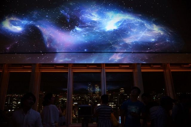 展望台スカイデッキ西側、最初に投影される星空今回の夜間投影イベントは、名古屋の夜景をより楽しんでもらうきっかけになるように企画。東京駅や進撃の巨人プロジェクションマッピング「ATTACK ON THE REAL」演出など、全国各所のプロジェクションマッピングの演出・制作を手掛ける松村亮太郎氏率いるNAKED Inc.i9.映像作品。投影は、展望台内部で西・北・南3方向にて、映像が展開。作品テーマは、「子供の頃見た未来都市」をベースに、中部圏ではなじみ深い観光地「昼神温泉」エリアの長野県阿智村「日本一の星空」を再現、月の光が夢の街を描き出す「MOON LIGHT」花火の万華鏡をモチーフにしたアートワーク「FIREWORKS」などを織り交ぜ、展望台から見下ろす名古屋の夜景をより幻想的に演出します。先行投影に先立ち、星空のモデルとなった長野県阿智村観光協会 小島氏からは、「スキー場にも関わらず、冬より夏に夜景を楽しむことで観光客が多い、阿智村の本物の夜景をこれをきっかけにぜひ見に来てほしい」とのPRエールもあり、都心部で星の少ない星空をこの投影で、雰囲気だけでも味わうことができます。