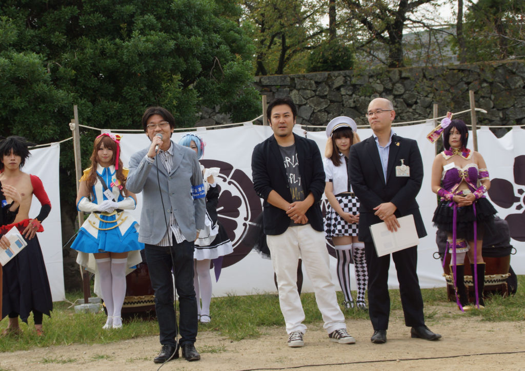 【写真】名古屋コスプレホストタウンPR隊に採用されたメンバー12名今回、選考会に参加したコスプレイヤーは12名。 簡単なランウェイの後、マイクの前で、名古屋城を訪れた観覧者と審査員に、意気込みをアピール。審査員には、コスプレイヤーズアーカイブ・吉田氏(左) WCS・森氏(中央)と名古屋市観光文化交流局ナゴヤ魅力向上室・只井氏(右)が、隊員の採用審査。