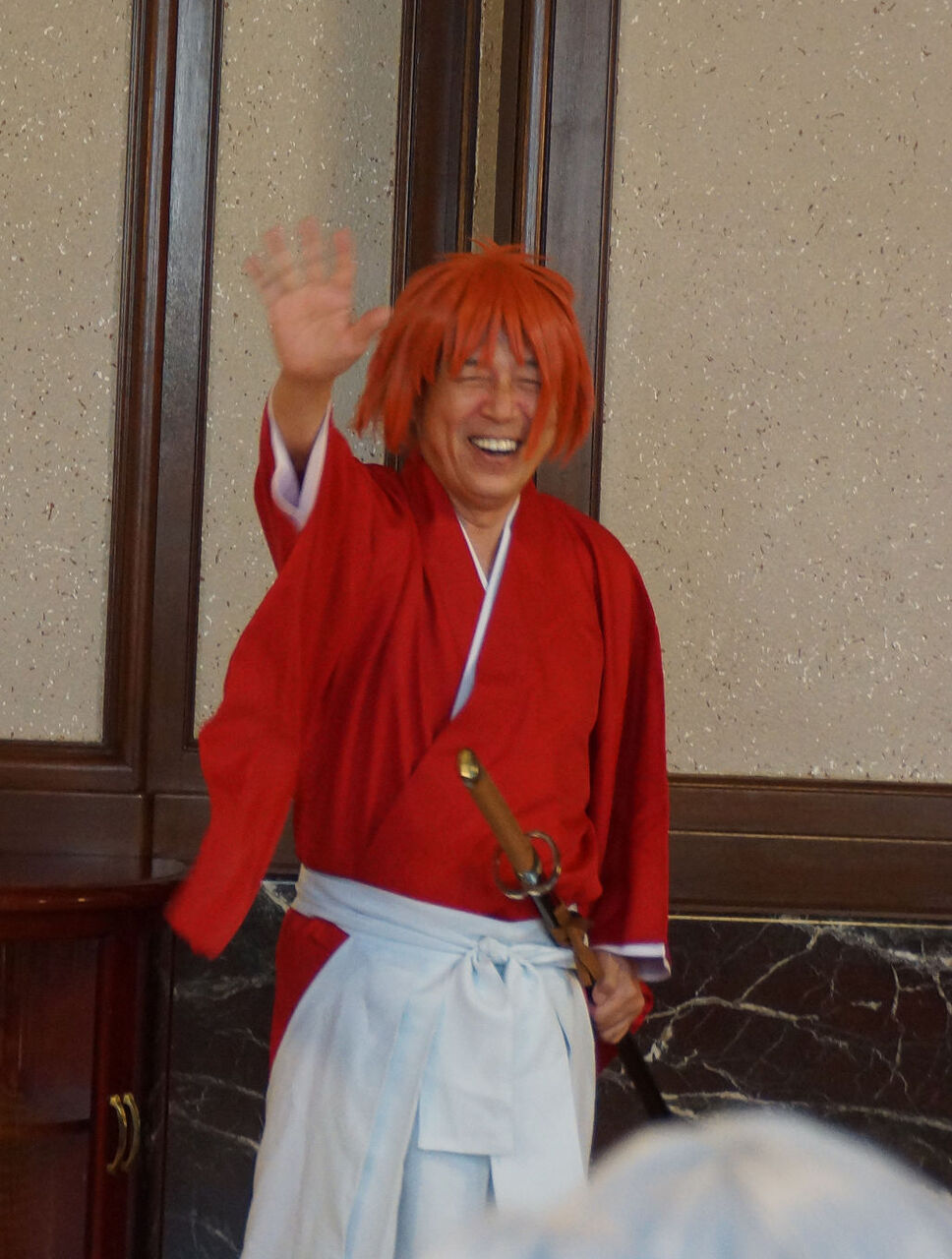 【写真】広沢名古屋市長<緋村剣心に扮して、各国代表を歓待。世界コスプレサミットの開催を控え、世界各国から来日した代表チーム41か国/地域から18チーム36名が、名古屋市役所・正庁にて、広沢名古屋市長を表敬訪問。広沢氏は、人気作品「るろうに剣心」主人公・緋村剣心姿で登場。会場を沸かせました。