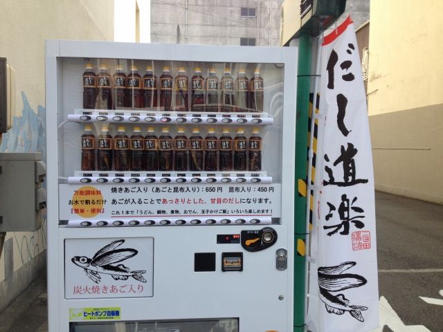 いろいろな変わり種の自販機が登場する大須エリアで、調味料を販売する自販機が登場。ペットボトルに入った「だし」2種類を販売する自販機のようです。焼きあごと昆布入り:650円 昆布:450円(2014.2.26現在の販売価格)場所は、本町通・第2アメ横ビルからちょっと北に向かった場所。そば屋さんの近所なので、お蕎麦好きに向けた販売なのかな ちょっと不思議な自販機でした。