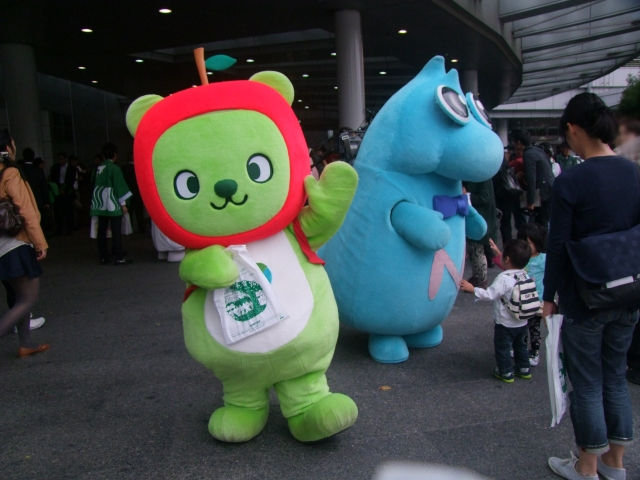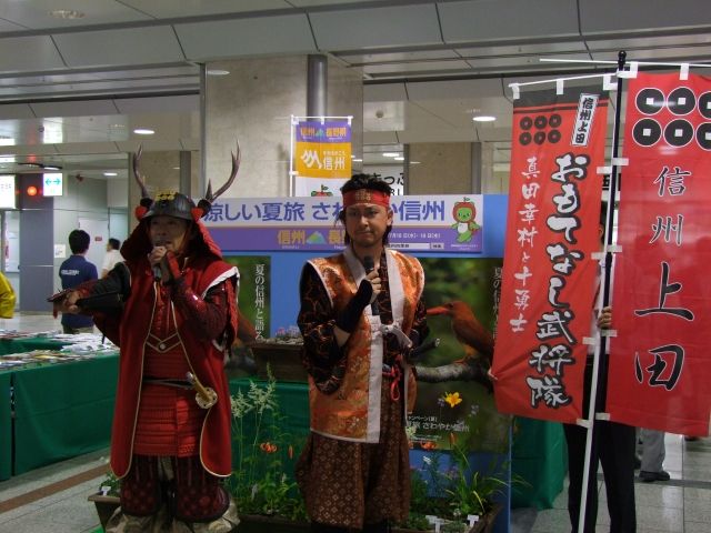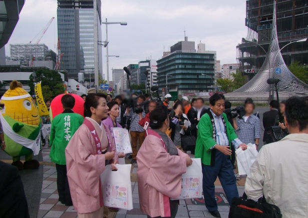 御嶽噴火1ヶ月目の節目を迎える2014年10月27日(月) 愛知県・名古屋市は、噴火の風評で観光目的の来訪者が減少する岐阜県下呂・高山地方や長野県木曽地方の観光支援活動をJR名古屋駅前にて実施。大村愛知県知事、河村名古屋市長も登場。秋の観光シーズンを迎えた人気観光地関係者や温泉旅館のおかみさんたちと共に、来訪啓発活動をしました。今回の噴火では、山頂登山中の観光客に対する戦後最大の被害だったこともあり、周辺エリアまで自粛する影響も大きく出でいますが、噴石の恐れのある山頂エリア4km四方の立入禁止・登山制限で、周辺の観光地の危険は今のところ無く、改めて、冬のシーズン前に、名古屋駅前では、現地の観光情報や案内がされていました。【写真下】信州のご当地キャラ・アルクマや愛知用水で木曽と縁のある日進市・ニッシーもPRのため応援参加。