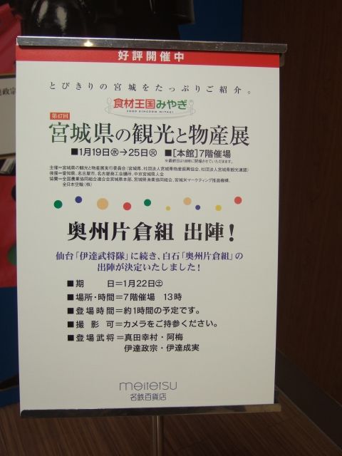 第47回宮城県観光と物産展が、2011/01/19(水)より名古屋駅・名鉄百貨店本店7階の催事場にて開催。