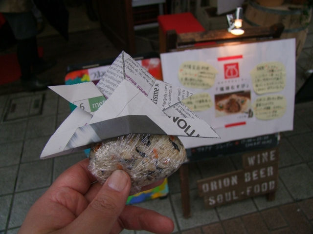 【写真】サキアテジョーグーによる「琉球むすび」販売された「円むす」、武将隊・甲冑隊行列に合わせて、紙かぶとを添えて提供した店舗も