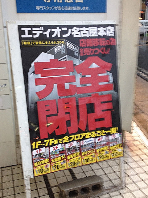 東海地区の家電基幹店舗「エディオン名古屋本店」(名古屋駅東)が、移転に伴う現名駅柳橋店舗の完全閉店を告知。閉店セールを実施していました。