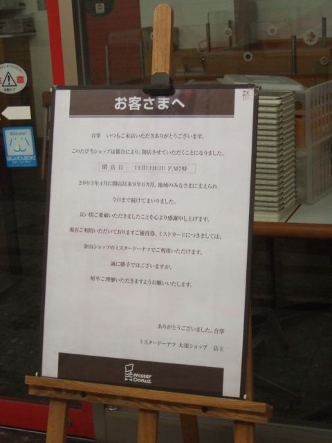 万松寺ビル1Fのミスタードーナツ大須ショップが、2012/11/11(日)の営業を以て閉店。2003年4月に開店したこちら、気軽に立ち寄れる若者向レストポイントが少なかった大須では、人気を集めたスポットでした。いままでありがとう。お疲れ様でした。