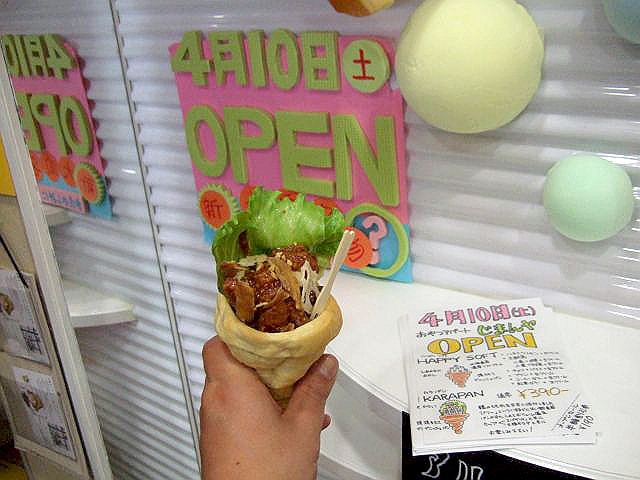 店頭では、クロワッサンのような手作りパンに、アイスクリームをトッピングしたスイーツ系メニュー(写真右)と自慢の唐揚げを中に詰め込んだ、サンドイッチ風のメニュー(写真下)が登場中。おいしさ満点のこちらのメニュー、オープン初日は、口コミだけで、パンが途中で売り切れてしまうほどの人気でした。