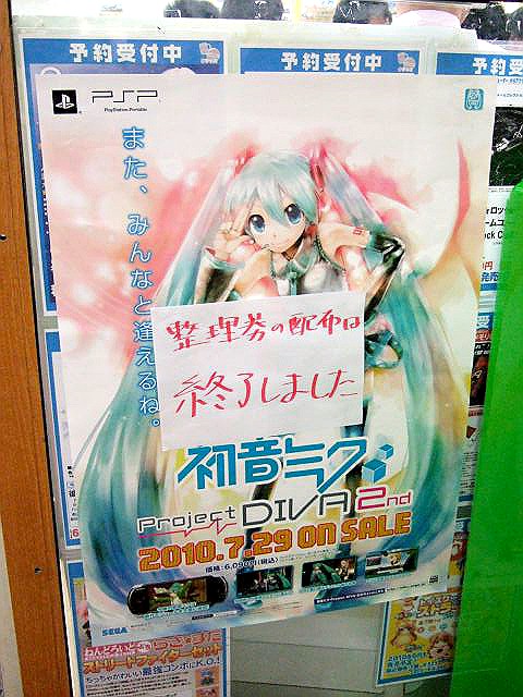 3月9日「ミクの日」に合わせて、WonderGOO大須店の1F店頭では、初音ミク特設コーナーが登場。7月に発売される予定のPSPソフトProjectDIVA2ndの予約も店頭受付開始中でした。