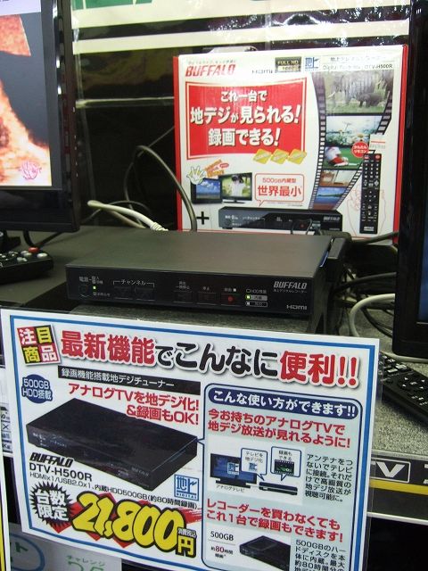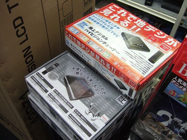 家電量販店と違って、意外と廉価な地デジチューナーが店頭にあり、いろいろな種類を選ぶことも。またネットの新規契約による導入割引相談も。現在大須で見ることのできる簡易地デジチューナーの価格帯は、5〜6千円のモノが主体。中には、特価で3千円の激安チューナーも。そのほか、価格帯の高いものは、多機能タイプで録画機能がついたりしています。接続もテレビに「ビデオ端子」が付いていれば接続することは可能。