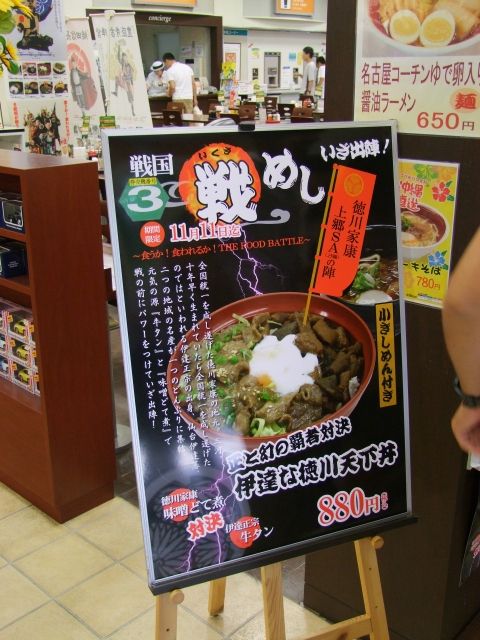 名古屋おもてなし武将隊6武将が、押し「戦めし丼」メニューを競い合う!!中部地区・高速道路SAで展開する中日本エクシス(株)は、名古屋おもてなし武将隊とタイアップ、名古屋を中心とした近隣SA・PAの飲食メニューとして戦(いくさ)めし丼キャンペーンを2013年8月8日より2013年11月11日(月)まで開催。ご当地「名古屋おもてなし武将隊」6武将が、それぞれのエリアで、押し「戦めし丼」メニューを展開し、売上を競い合う形式。メニューは全53品目 どれも、それぞれのSA・PAエリアにゆかりの深いメニューや武将オリジナルメニュー、結構ガッツリ系で食べごたえある品々ばかり。