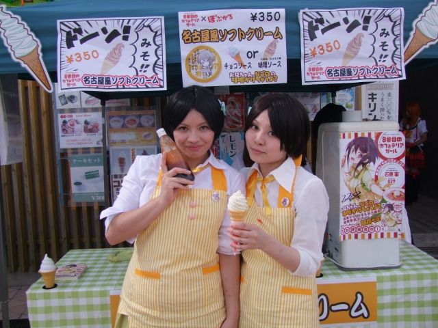 今回の大ぽぷかる展では、名古屋ご当地ライトノベル「八番目のカフェテリアガール」とのコラボブースも登場。ソフトクリームに、あの味噌を掛けて食べることのできるサービスも。石原宙先生によると、みんな喜んで体験されるそうなんですが・・・、うん微妙な感じ。なお、甘味噌とチョコと選択できる模様。