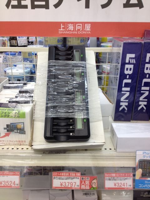 久しぶりに、ドスパラ名古屋大須店2Fの上海問屋コーナーを覗いたら、観光客や城友さんの間で人気の自撮棒の手ごろなものが置いてありました。長さも調整しやすいビックサイズ。また、一度に16本充電できるNi-H単三充電池用の充電器も登場中。単三用カメラユーザーには、良いアイテムも