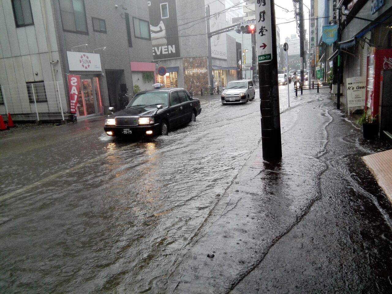2017年8月11日ゲリラ降雨による大雨で、水没する大須裏門前町通/赤門通交差点改修はされたのですが、排水が追い付かないと20〜30cm冠水して、周りのお店も水に浸かることで陽明なスポットです