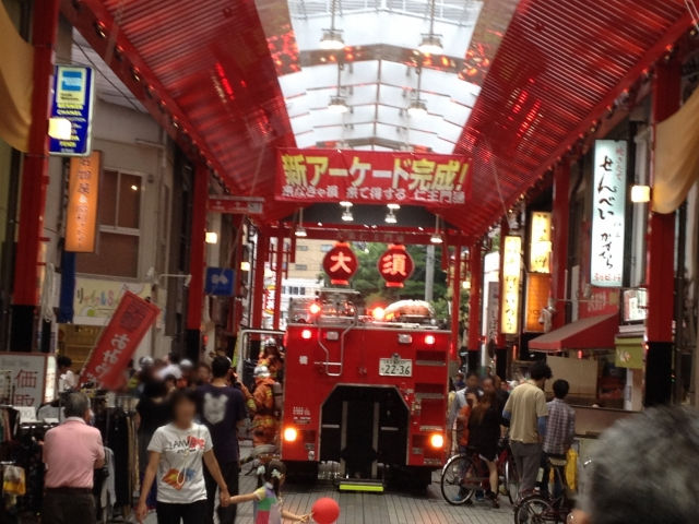 201406/30(月)午後5時40分頃、大須仁王門通商店街に隣接するビル屋上にて火災。幸いすぐに消し止められましたが、消火の為、歩行者天国のアーケード内にポンプ車が2台緊急出動し、人でにぎわう商店街は、一時騒然。